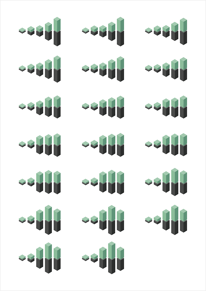 Grundlage für die Visualisierung muss ein Datensatz mit einer Zeitdimension sein. Nach einer Themenrecherche widmen wir uns dem Experimentieren und Entwerfen. Wir arbeiten prozessorientiert: die Variantenbildung und der Prozess stehen im Mittelpunkt, weniger das Ergebnis.